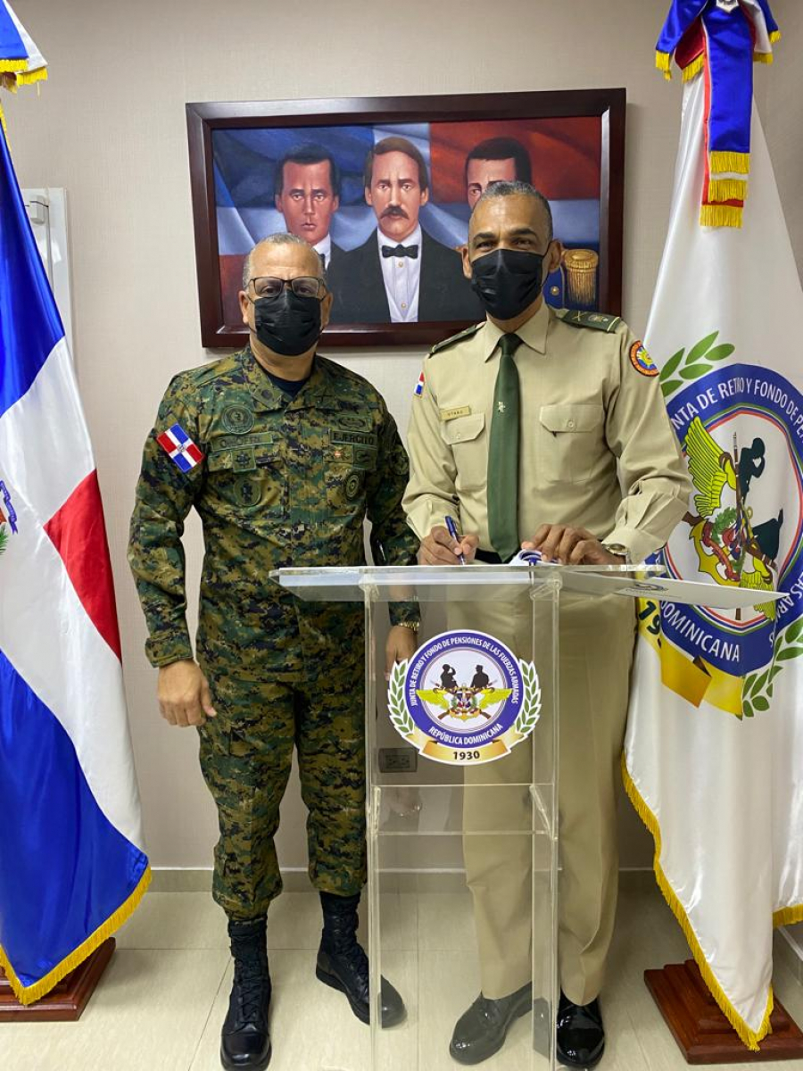 Santo Domingo. - El Mayor General Carlos A. Fernández Onofre, ERD., Presidente de la Junta de Retiro y Fondo de Pensiones de las Fuerzas Armadas recibió la visita de trabajo del General Juan José Otaño Jiménez, ERD, Presidente del Consejo de Administración de Coopinfa, para aunar esfuerzos en procura del bienestar de los pensionados de las Fuerzas Armadas.